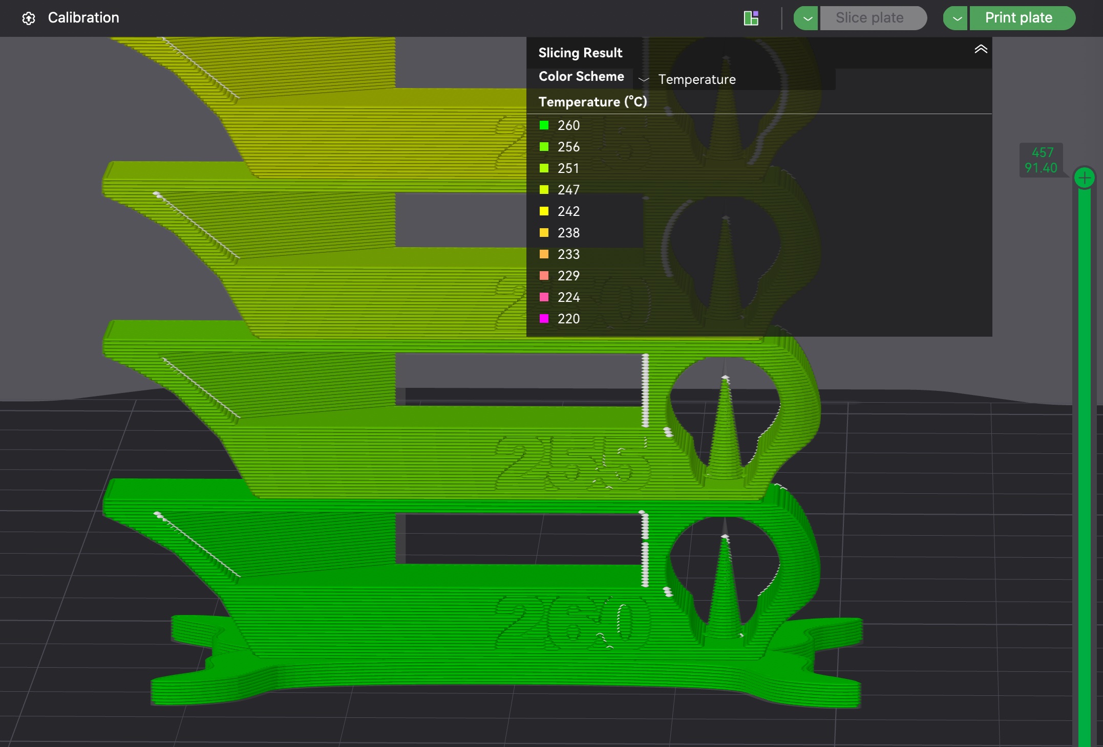 Slice the model and switch the color scheme to Temperature. Make sure that each floor of your sliced mode is the right color. Note that BambuStudio is showing the wrong temperatures, eg. 256 instead of 255 and 224 instead of 225. I don't know why this is. The values are correct in the G-code. See the next section.