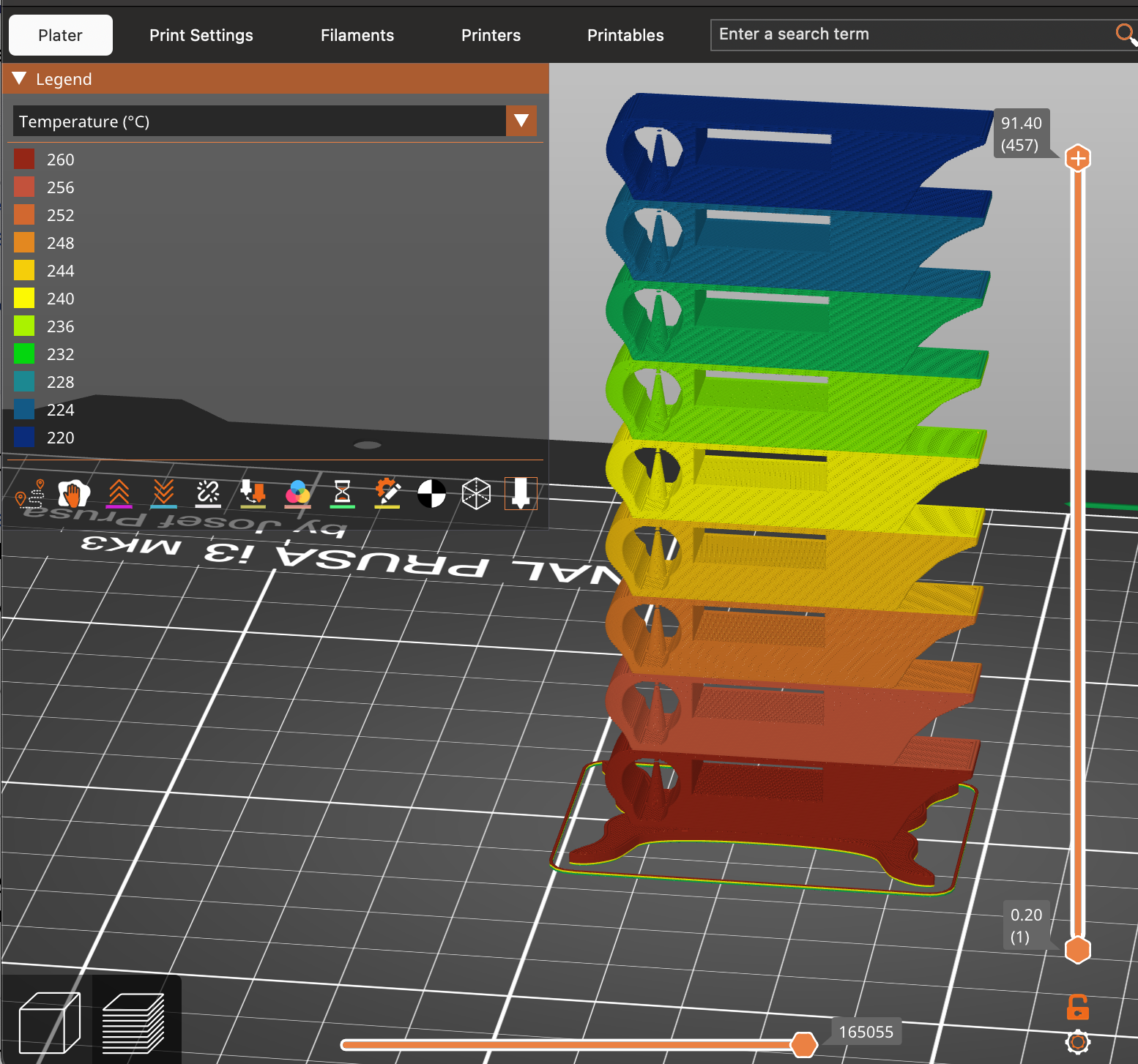 Slice the model and switch the Legend to Temperature. Make sure that each floor of your sliced mode is the right color. Note that PrusaSlicer is showing the wrong temperatures, eg. 256 instead of 255 and 224 instead of 225. I don't know why this is. The values are correct in the G-code. See the later section.