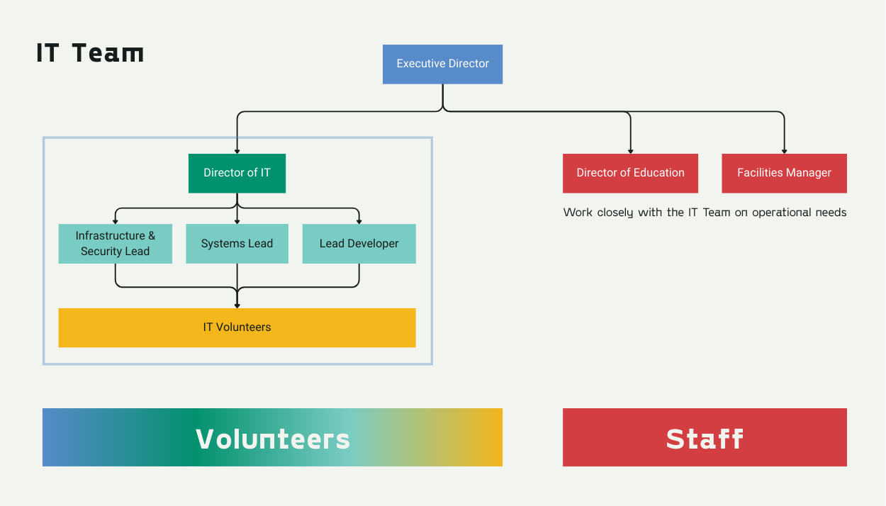 The IT Team is organized under the Director of IT, with dedicated leads for software development, systems, and infrastructure/security. This structure helps distribute responsibilities, empower volunteers to contribute where they’re strongest, and ensure no single person is overloaded.