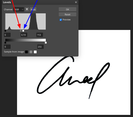 You want to move the White Point so that all of the paper texture, extraneous shadows, and so forth are changed to pure white. You want to move the Gray Point to pretty close to the white point because we want this to be Black & White.